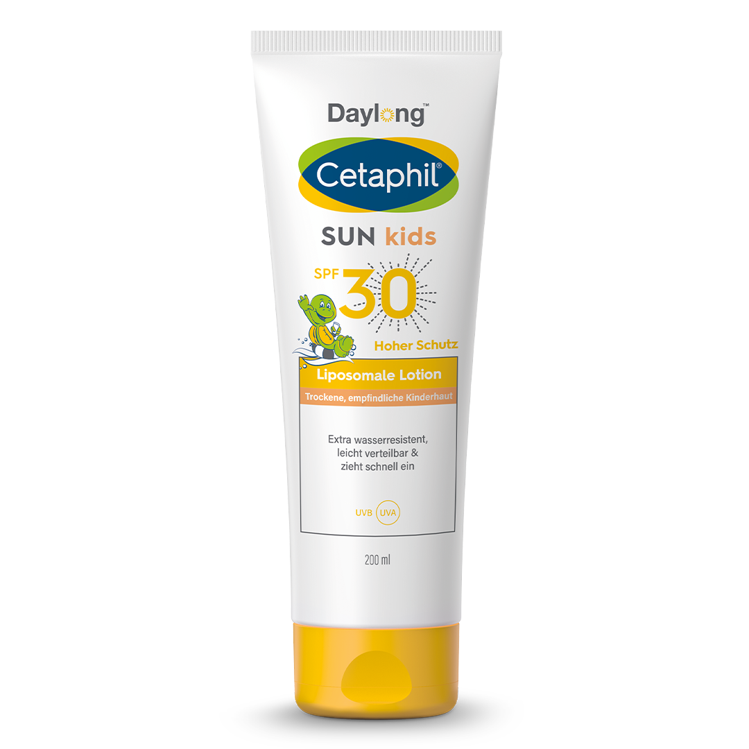 Die Cetaphil® Sun Daylong Kids Lotion SPF 30 ist auf die anspruchsvolle Kinderhaut maßgeschneidert. Sie zieht schnell in die Haut ein und spendet dank Aloe Vera und Vitamin E 24 Stunden lang Feuchtigkeit, wodurch ein Austrocknen bei längerem Aufenthalt in der Sonne oder im Wasser verhindert wird. Durch die liposomale Zusammensetzung (hautähnlicher Aufbau der Moleküle) verteilen sich die photostabilen UVA-, UVB- und IR-Filter gleichmäßig, schützen die Haut und beugen sonnenbedingter Hautalterung vor.