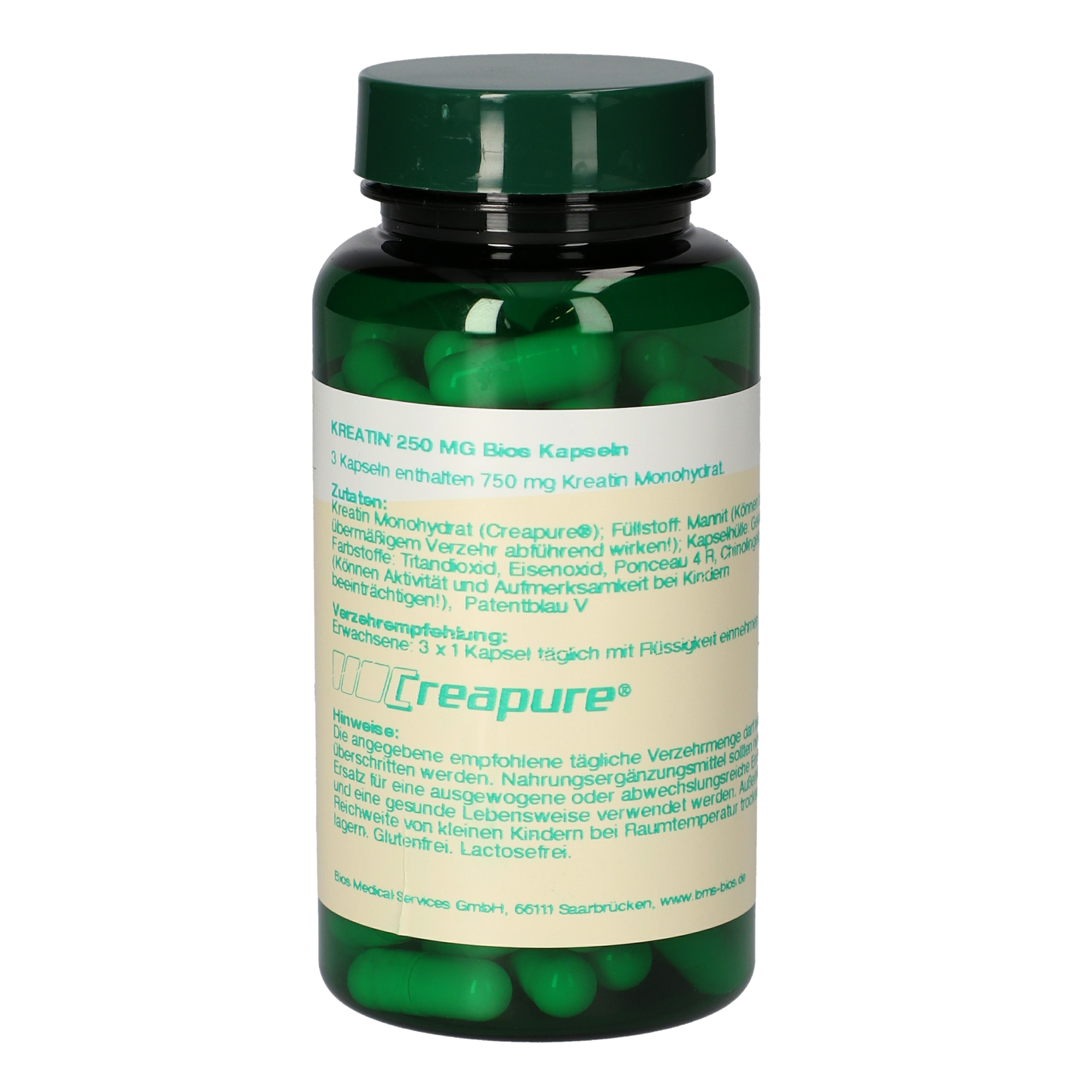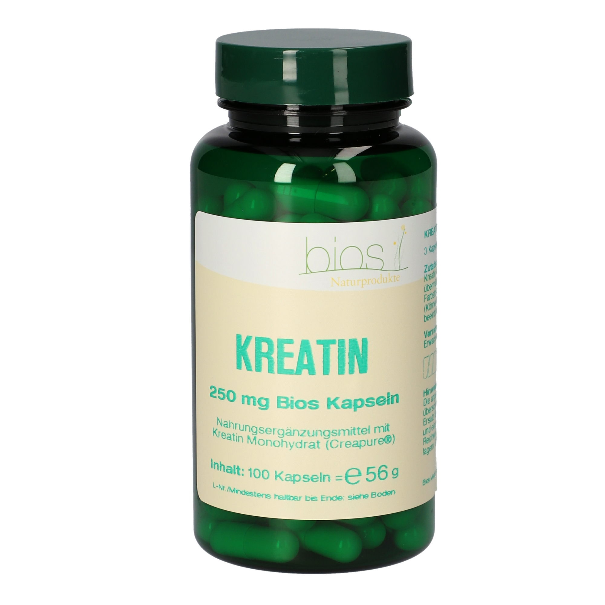 Ob beim Kraftsport, für den 100-Meter-Sprint oder auch für Sportarten mit schnellen kurzen Bewegungen (Tennis, Fußball, Eishockey) – funktionierende Muskeln sind der entscheidende Schlüssel zum Erfolg. Der „Treibstoff“ für Bewegung ist die Energie. Kreatin 250 mg Bios Kapseln enthalten das hochwertige Kreatin-Monohydrat Creapure® der Firma AlzChem AG. Dies ist die körpereigene Form von Kreatin, wie sie in jeder Muskelzelle natürlicherweise vorkommt. Als Nahrungsergänzungsmittel dient diese Substanz als Booster für die Skelettmuskulatur. Kreatin steigert die körperliche Leistungsfähigkeit bei aufeinanderfolgenden, kurzzeitigen, hochintensiven Übungen. Die tägliche Einnahme von Kreatin kann die Wirkung von Krafttraining auf die Muskelkraft bei Erwachsenen über 55 Jahren verbessern.