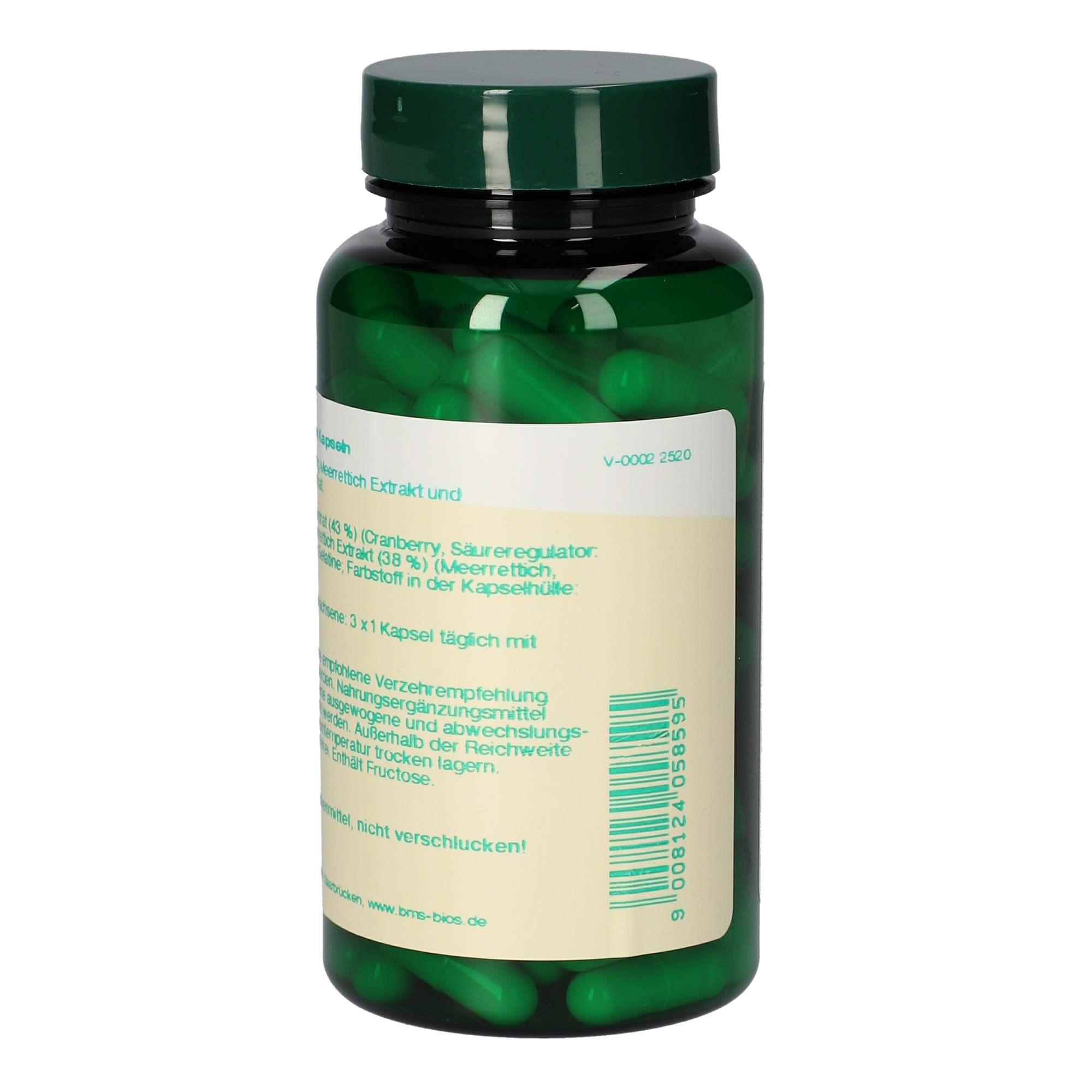3 Kapseln enthalten 600 mg Meerrettich Extrakt und 690 mg Cranberry Extrakt, entsprechend 6,9mg Proanthocyanidine.