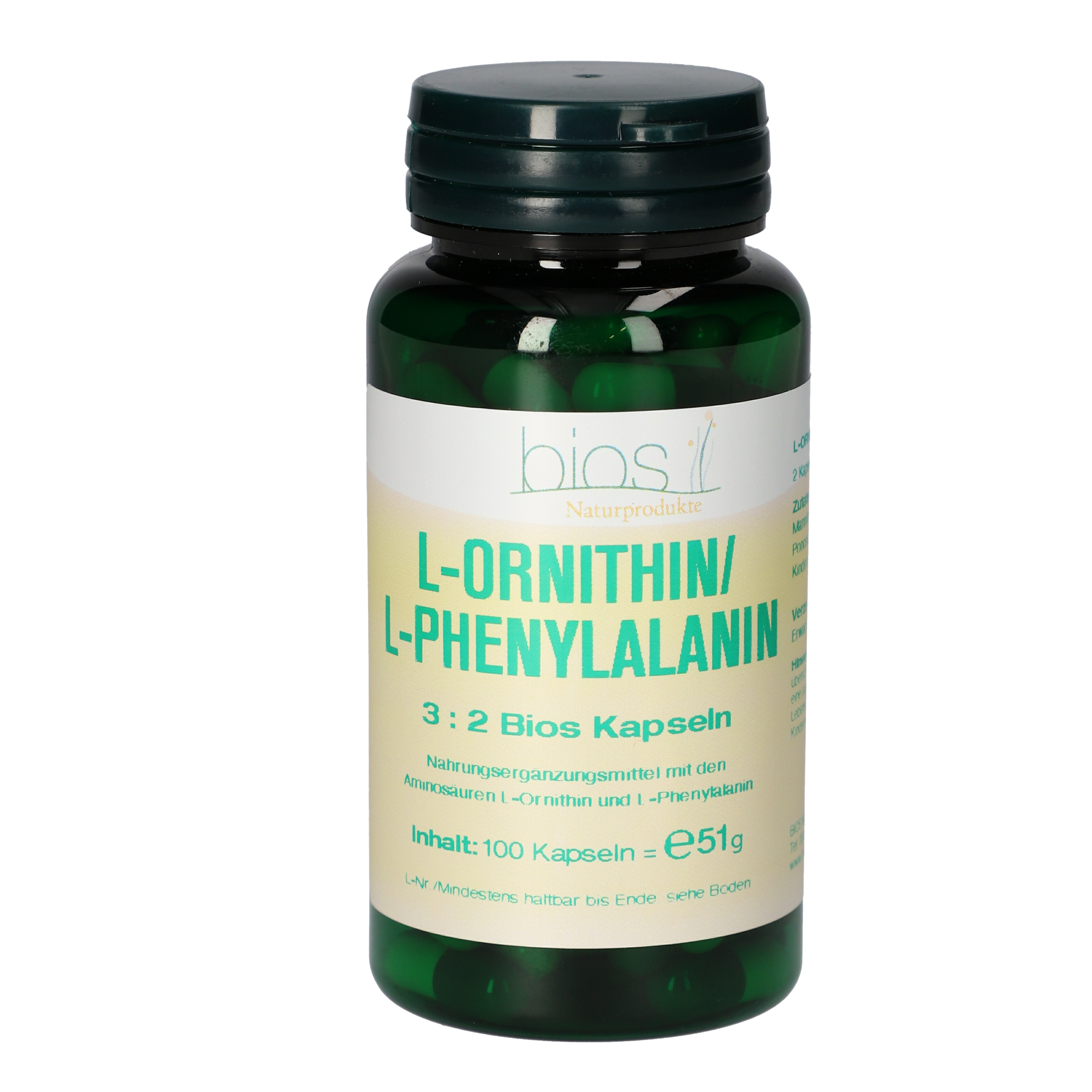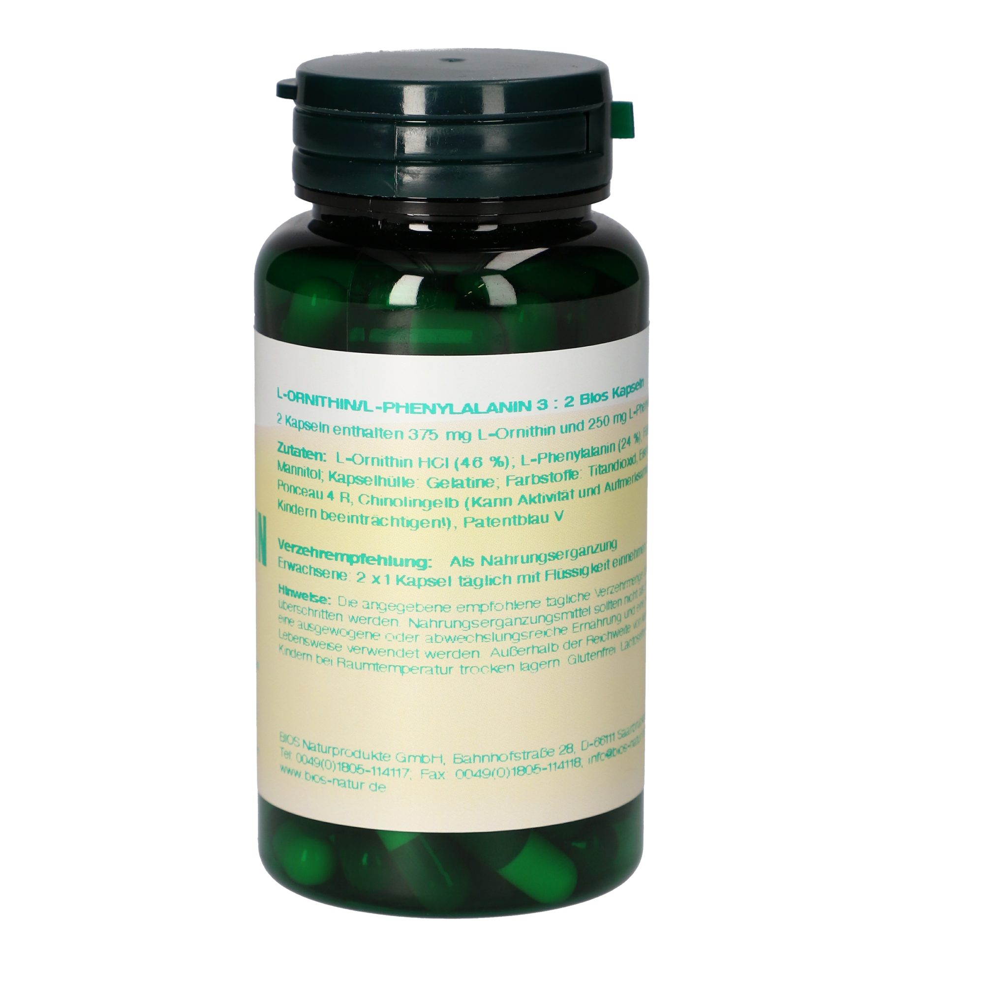 2 Kapseln enthalten 375 mg L-Ornithin und 250 mg L-Phenylalanin.