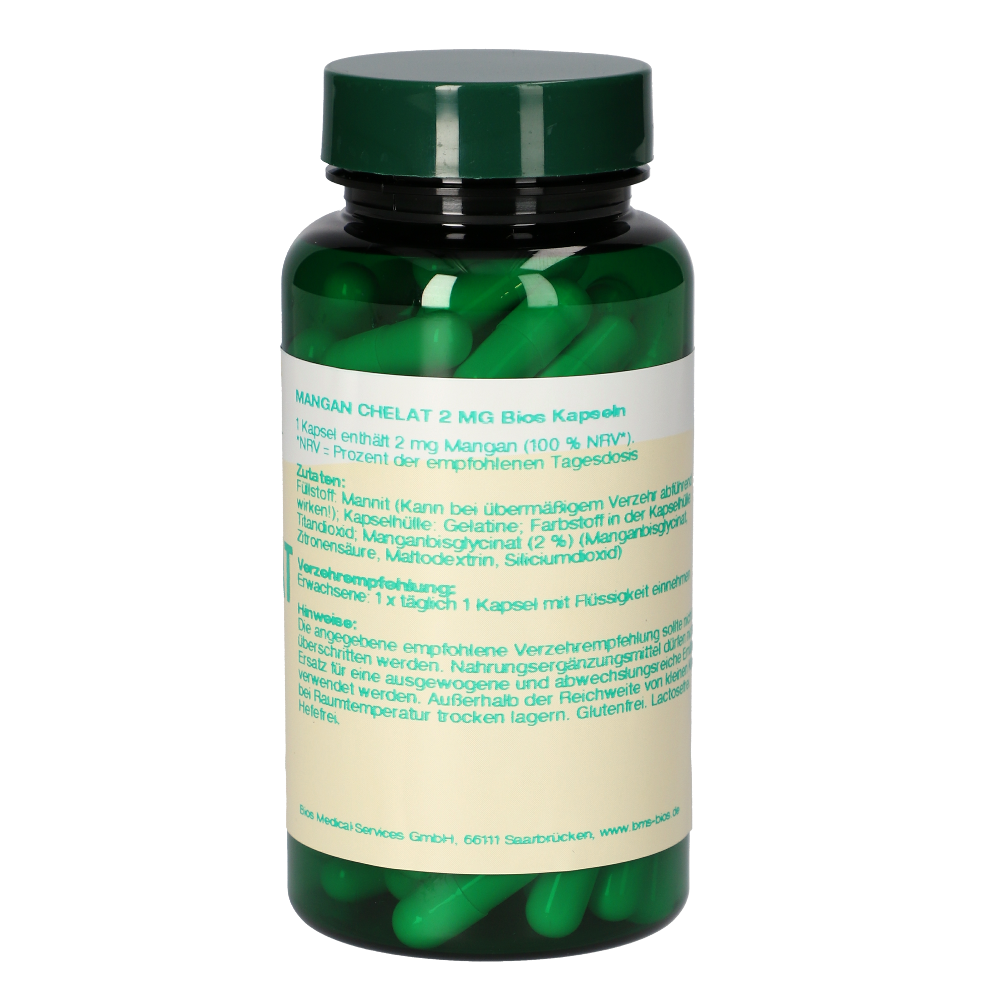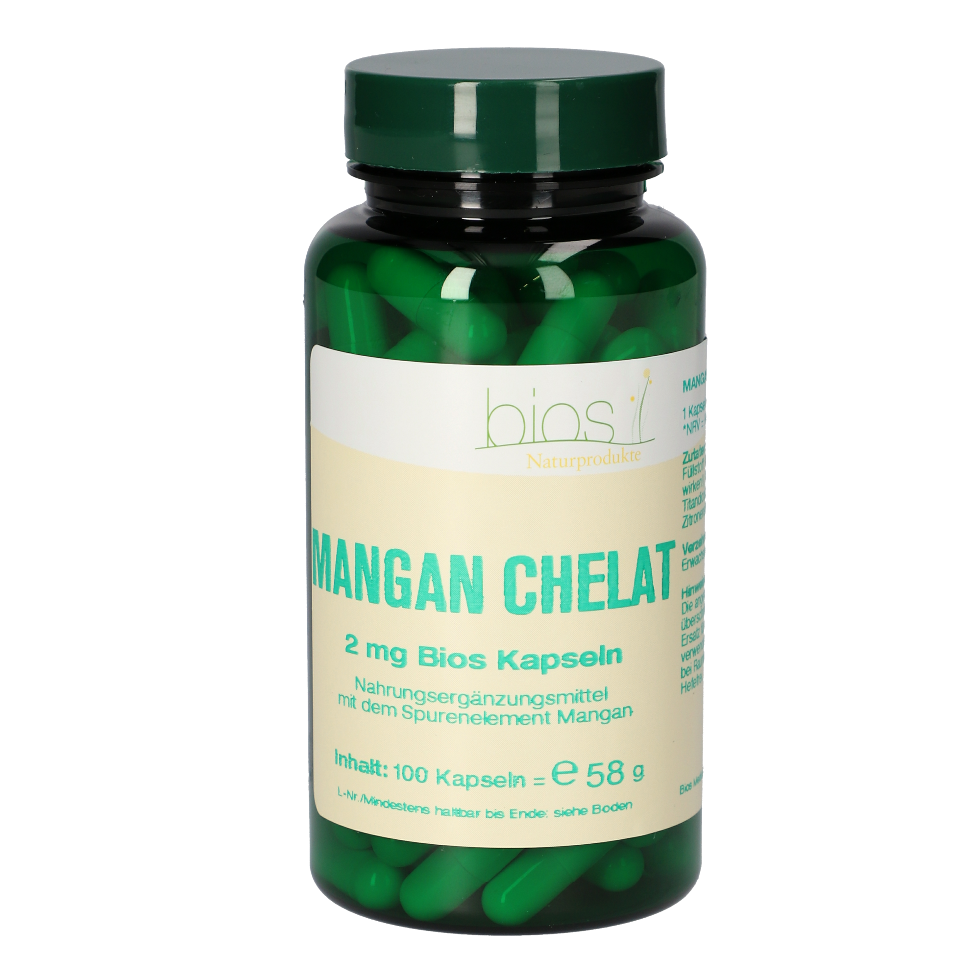 Mangan ist für alle Lebewesen ein essenzielles Spurenelement und ist als solches an vielen wichtigen Funktionen des Körpers beteiligt. Mangan wird für die Bildung von Proteoglykanen und Kollagen benötigt, beides strukturelle Bausteine für Knorpel, Knochen und Bindegewebe und trägt somit entscheidend zu einer normalen Bildung von Bindegewebe und zum Erhalt normaler Knochen bei. Als Cofaktor der Superoxiddismutase ist es am Abbau reaktiver Sauerstoffspezies beteiligt und trägt zum Schutz der Zellbestandteile vor oxidativen Schäden bei. Mangan trägt außerdem zu einem normalen Energiestoffwechsel bei. Mangan Chelat 2 mg Bios Kapseln enthalten Mangan in Form des chelatierten Mangansalzes Manganbisglycinat. Durch die Chelatstruktur wird die Stabilität der Verbindung im gastrointestinalen Milieu erhöht und Wechselwirkungen mit anderen Nahrungsbestandteilen werden verringert, so dass Mangan in dieser Verbindung besonders effizient verwertet werden kann.