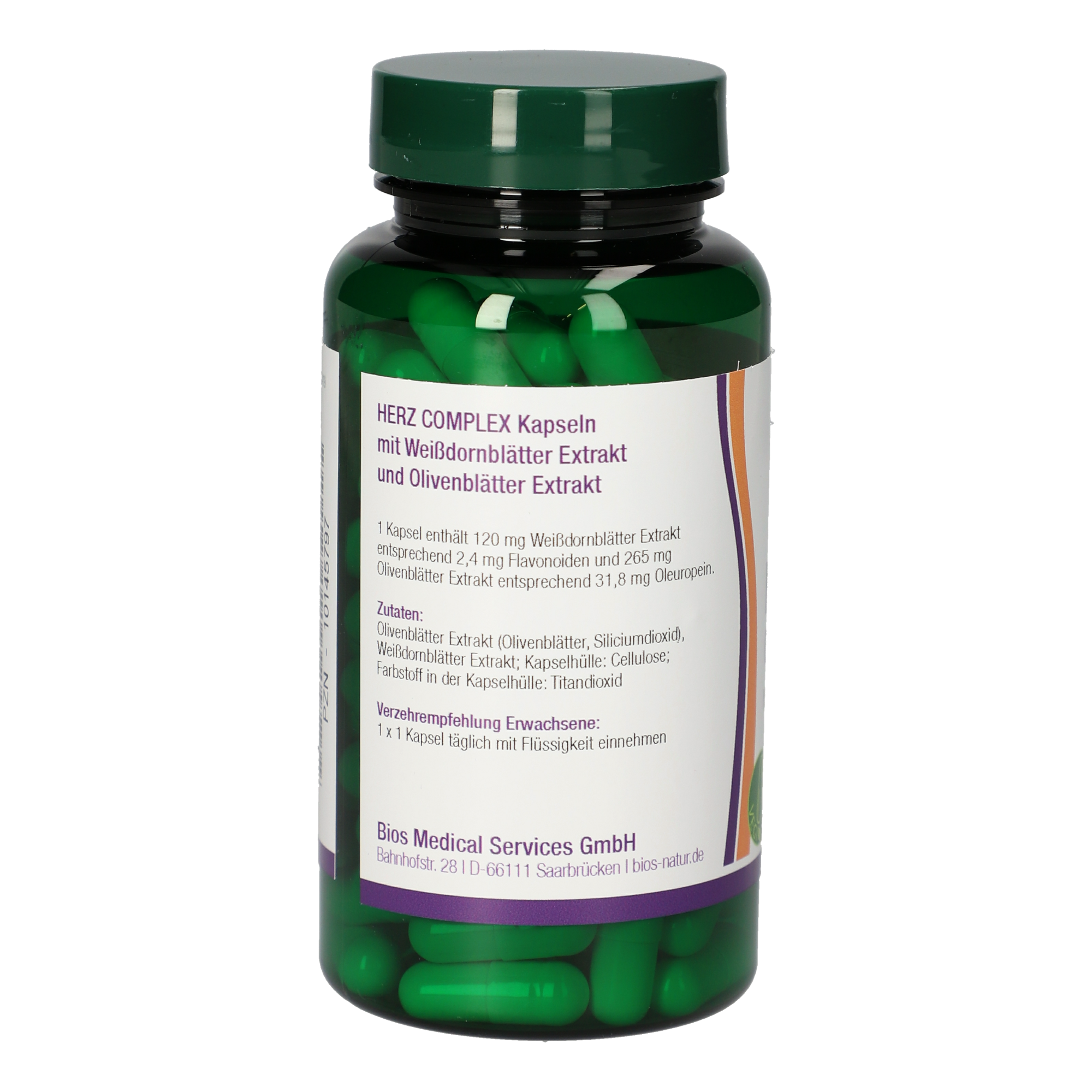 1 Kapsel enthält 120 mg Weißdornblätter Extrakt entsprechend 2,4 mg Flavonoiden und 265 mg Olivenblätter Extrakt entsprechend 31,8 mg Oleuropein.