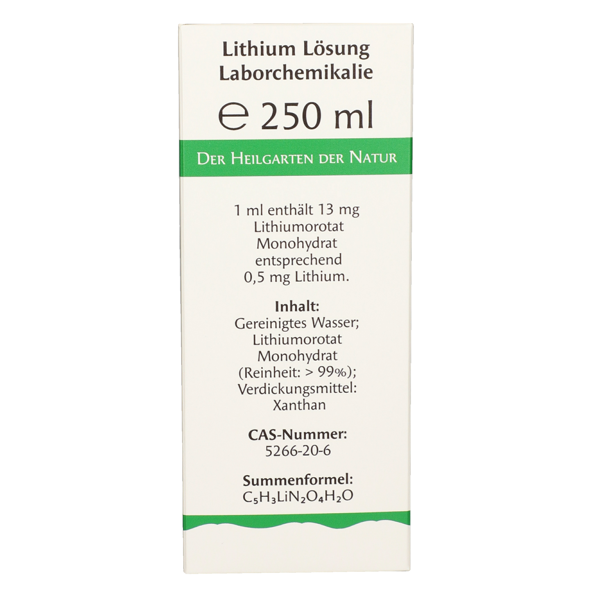 Lithiumorotat ist das Resultat der Verbindung des Spurenelements Lithium mit Orotsäure, wobei ein stabiles Salz entsteht. Gemäß der chemischen Klassifikation wird Lithium den Alkalimetallen zugeordnet. Lithiumsalze treten in Salzlaugen, zumeist in Salzseen, jedoch auch in anderen Gewässern, auf. In der vorliegenden Lösung beträgt der Gehalt an elementarem Lithium 0,5 Milligramm pro Milliliter, entsprechend 13 Milligramm Lithiumorotat Monohydrat, welches vollständig in gereinigtem Wasser gelöst ist. Dank dieser Zusammensetzung ist eine zuverlässige und reproduzierbare Verwendung in technischen und wissenschaftlichen Anwendungen möglich. Der Überkarton schützt vor Lichteinwirkung und trägt zur chemischen Stabilität bei. Die mitgelieferte Dosierhilfe mit Skalierung ermöglicht eine präzise Probennahme für den Laboralltag.