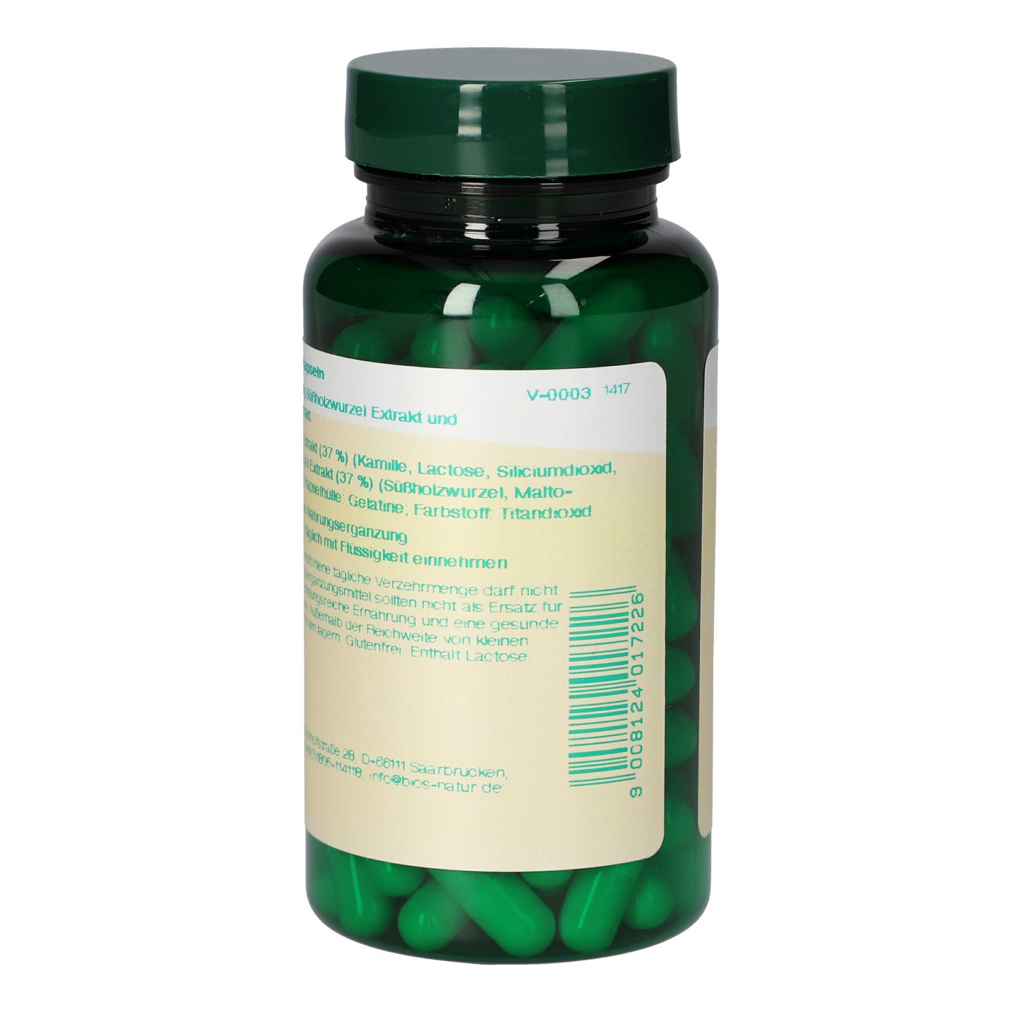 4 Kapseln enthalten 800 mg Kamillenblüten Extrakt und 800 mg Süßholzwurzel Extrakt.