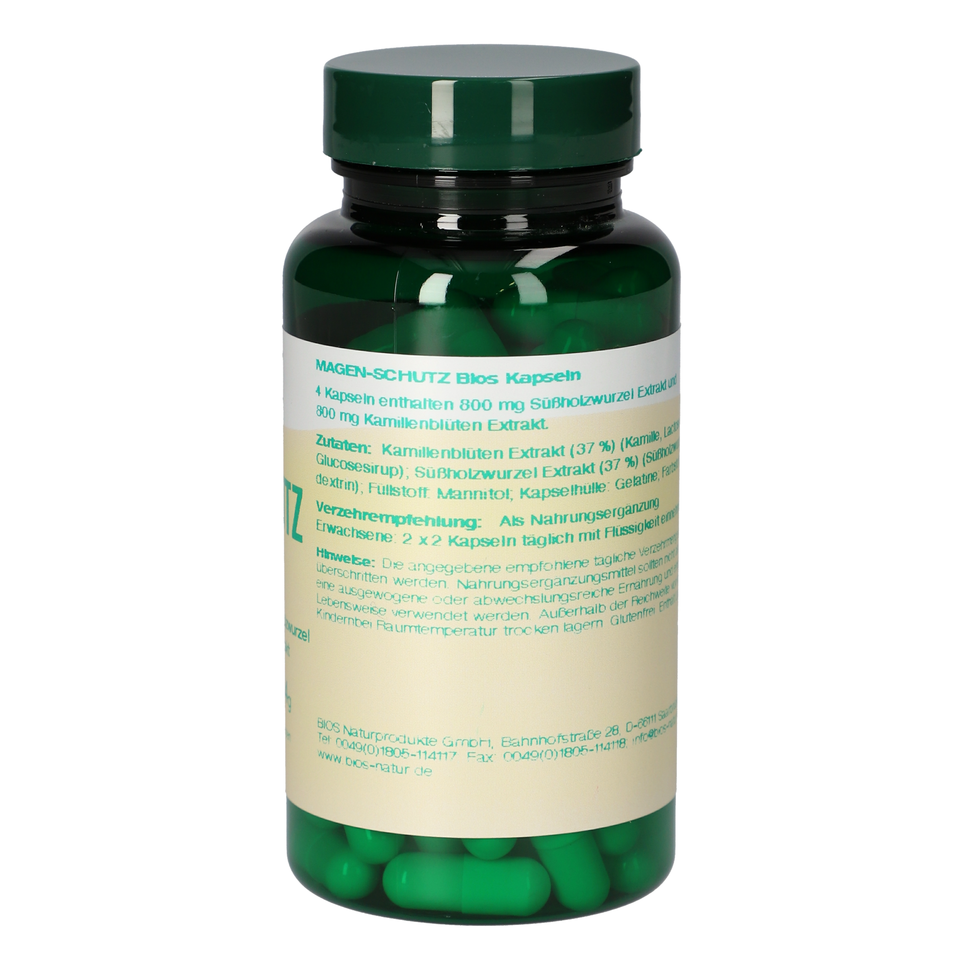 „Liebe geht durch den Magen“, aber auch „Stress schlägt auf den Magen“. Magen und Darm gelten nicht nur sprichwörtlich als Spiegel der Seele. Die Psyche hat einen erheblichen Einfluss auf die Tätigkeit von Magen und Darm. Mit einer Gesamtanzahl von etwa 200 bis 600 Millionen Nervenzellen, die unseren Darm umgeben, steht dieser Teil unseres Körpers in unmittelbaren Zusammenhang zu unserem Gehirn und kommuniziert kontinuierlich mit ihm. Nicht verwunderlich, dass Stress den Organen unseres Verdauungstraktes ordentlich zu schaffen macht. Symptome wie Sodbrennen, Übelkeit und Völlegefühl können die Folge sein. Magen-Schutz Bios Kapseln enthalten eine Kombination aus Kamillenblüten- und Süßholzwurzel Extrakt. Seit unserer Kindheit sind wir mit der beruhigenden Wirkung der Kamille vertraut. Aber auch Süßholzwurzel sorgt für Entspannung von innen. Ganz zum Wohl für die Organe unseres Verdauungstraktes. Die Dauer der Anwendung sollte 4 bis 6 Wochen nicht überschreiten, die Einnahme kann jedoch nach einer Pause wieder fortgesetzt werden.