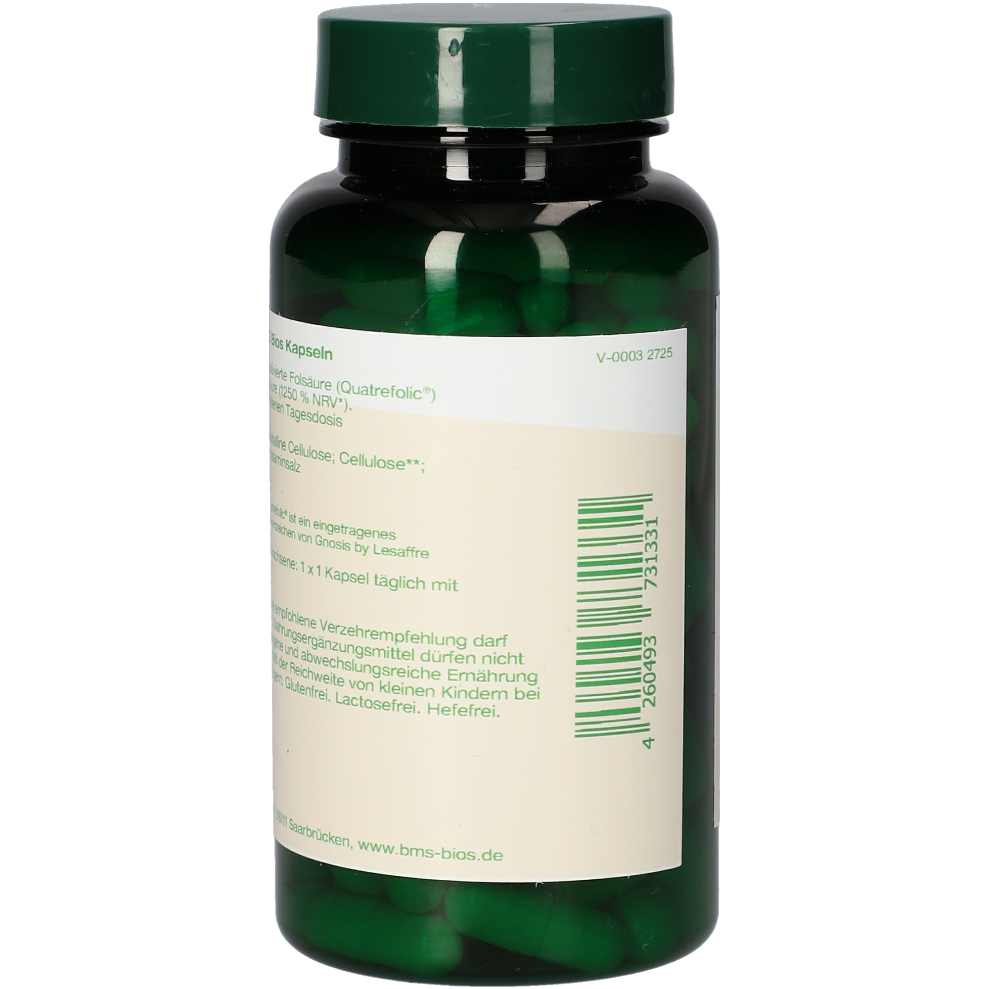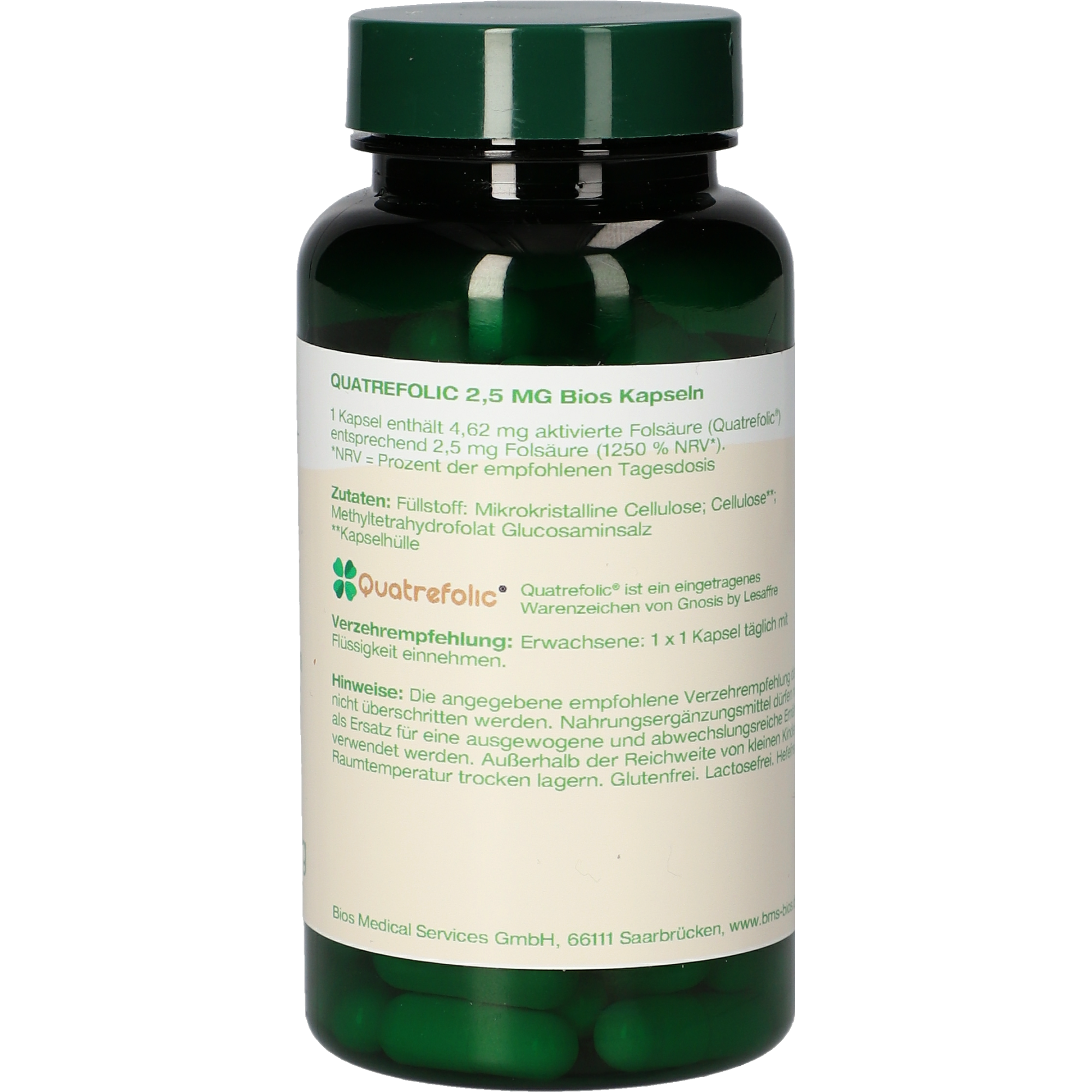 1 Kapsel enthält 4,62 mg aktivierte Folsäure (Quatrefolic®) entsprechend 2,5 mg Folsäure (1250 % NRV*)