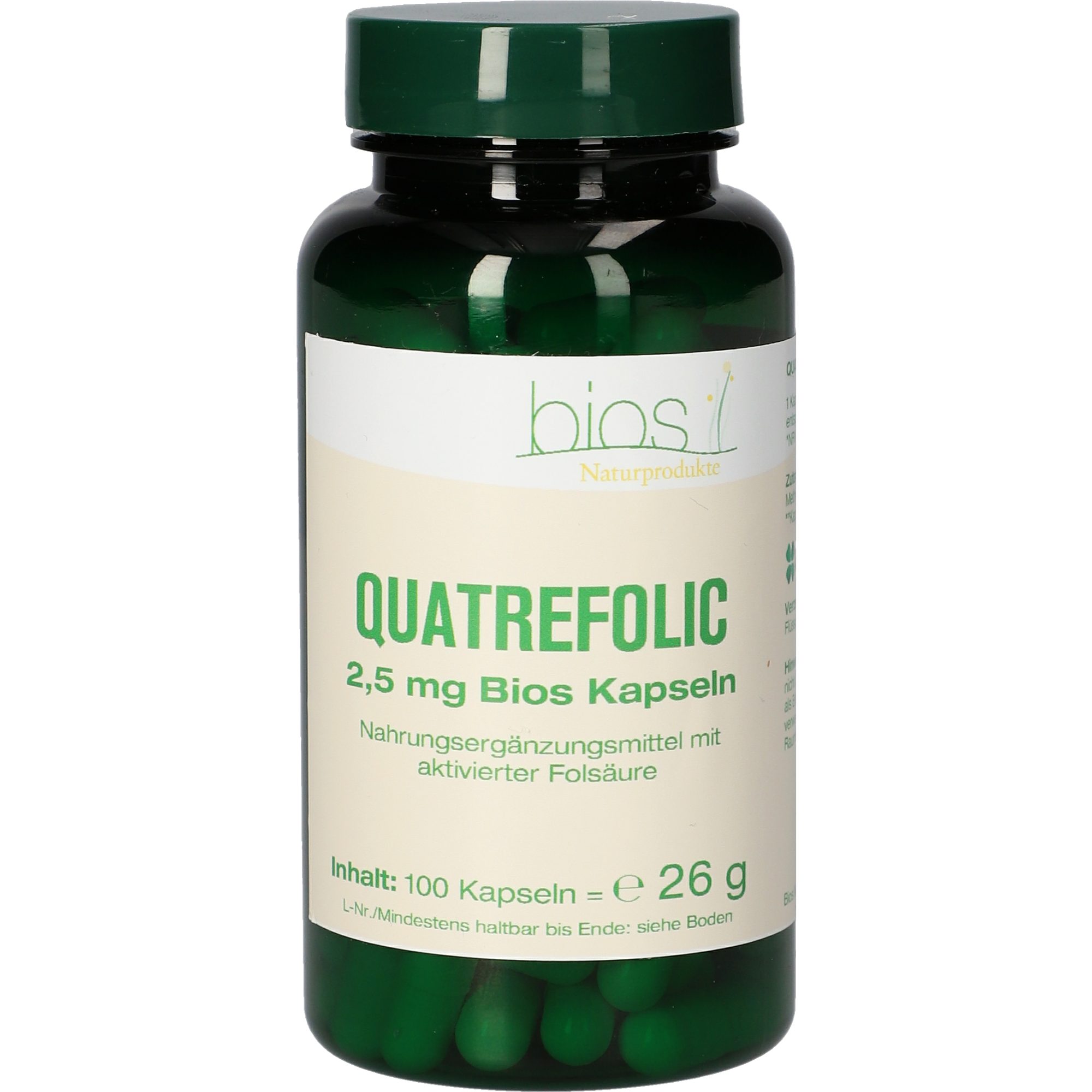 Quatrefolic 2,5 mg Bios Kapseln enthalten Folsäure in ihrer natürlichen, bioaktiven Form als 5-Methyltetrahydrofolat (L-5-MTHF). Dabei handelt es sich um die patentierte Premium-Substanz Quatrefolic®. In dieser Form kann Folat besonders effizient vom Körper aufgenommen und direkt verwertet werden, da es im Gegensatz zu Folsäure nicht erst durch mehrere enzymatische Schritte in die aktive Form umgewandelt werden muss. Bei manchen Menschen ist diese Umwandlung auch aufgrund einer genetischen Disposition stark eingeschränkt, sodass Folsäure nur unzureichend aktiviert werden kann. L-5-MTHF liegt bereits in methylierter Form vor und steht dem Körper daher unmittelbar für Methylierungsprozesse zur Verfügung. Zudem kann die Blut-Hirn-Schranke von 5-MTHF effizienter überwunden werden als von Folsäure. Folat trägt zu einem normalen Homocystein-Stoffwechsel und zu einer normalen Aminosäuresynthese bei und spielt eine Rolle im Prozess der Zellteilung. Darüber hinaus unterstützt es die normale Blutbildung und eine normale Funktion des Immunsystems und führt zur Verringerung von Müdigkeit und Erschöpfung. Folat fördert zudem die normale psychologische Funktion. Besonders während der Schwangerschaft ist die Aufnahme von Folat essenziell. Die zusätzliche Einnahme von Folsäure erhöht den mütterlichen Folatstatus. Ein niedriger mütterlicher Folatstatus ist ein Risikofaktor für die Entwicklung von Neuralrohrdefekten beim sich entwickelnden Fötus. Außerdem spielt Folat eine zentrale Rolle beim Wachstum des mütterlichen Gewebes während der Schwangerschaft.