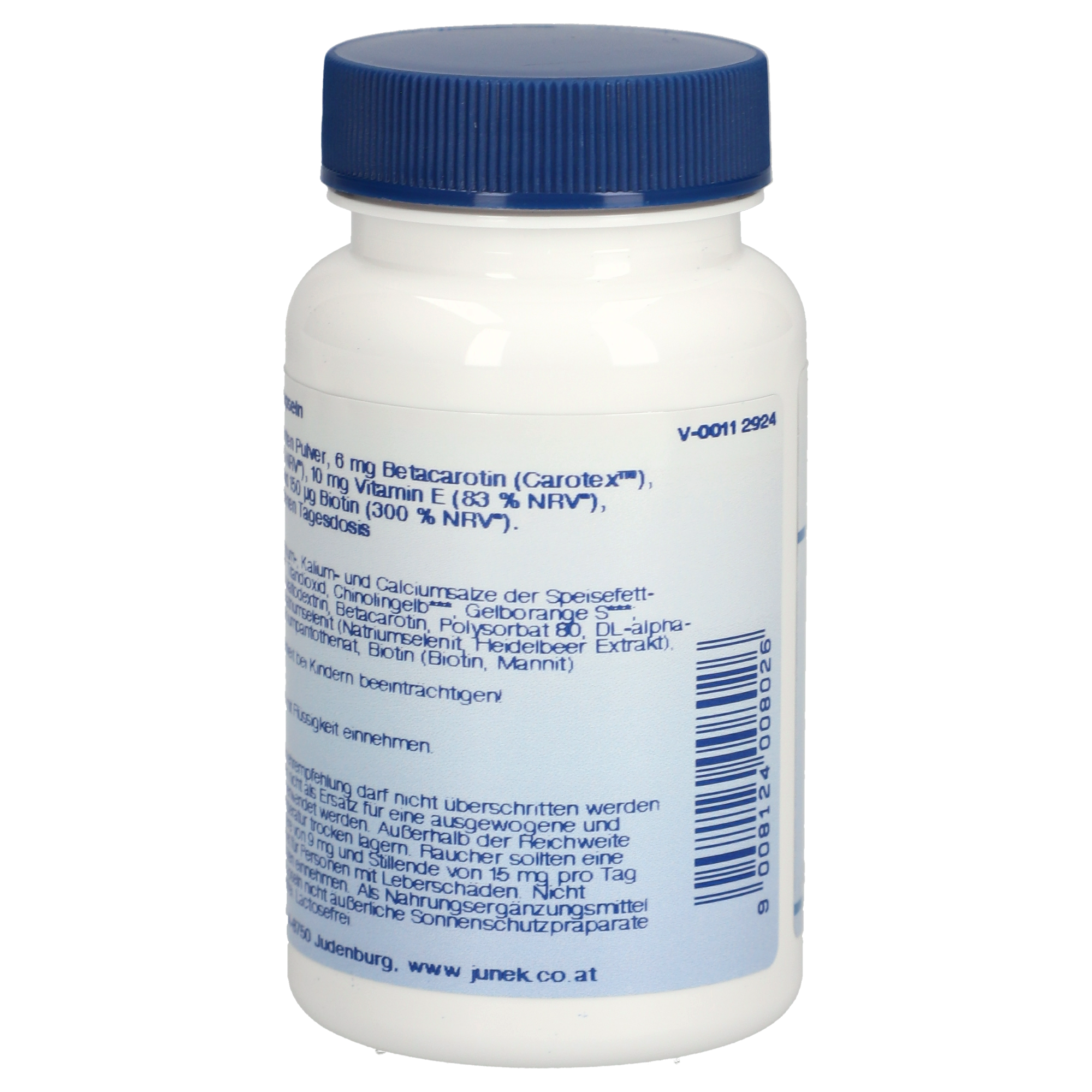 Die angegebene empfohlene Verzehrempfehlung darf nicht überschritten werden. Nahrungsergänzungsmittel dürfen nicht als Ersatz für eine ausgewogene und abwechslungsreiche Ernährung verwendet werden. Außerhalb der Reichweite von kleinen Kindern bei Raumtemperatur trocken lagern. Raucher sollten eine Dosierung von 20 mg, Schwangere von 9 mg und Stillende von 15 mg pro Tag nicht überschreiten. Nicht geeignet für Personen mit Leberschäden. Nicht zusammen mit Vitamin A-Präparaten einnehmen. Als Nahrungsergänzungsmittel ersetzen Sonnen-Schutz Junek Kapseln nicht äußerliche Sonnenschutzpräparate mit UV-Filter. Enthält Soja. Glutenfrei. Lactosefrei.