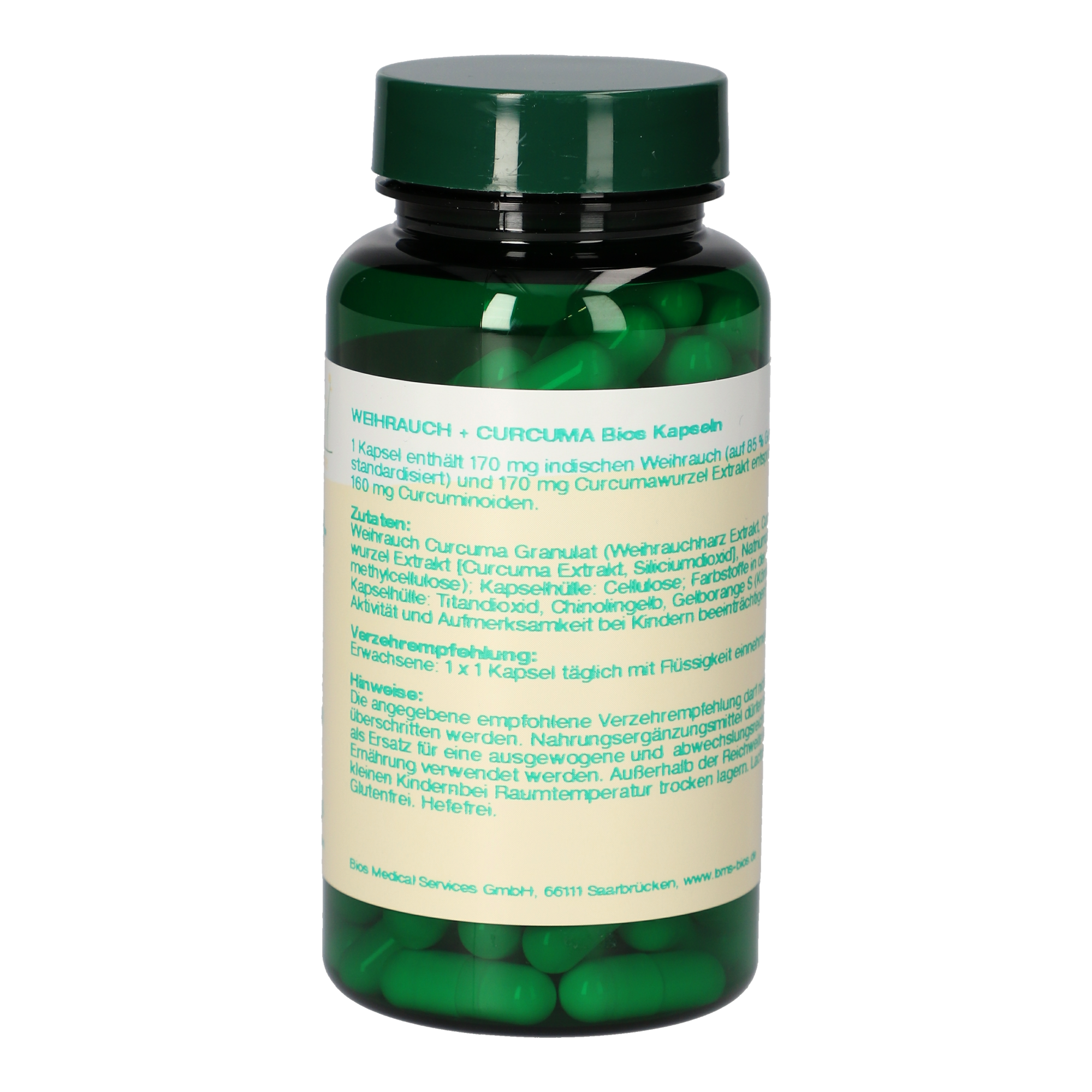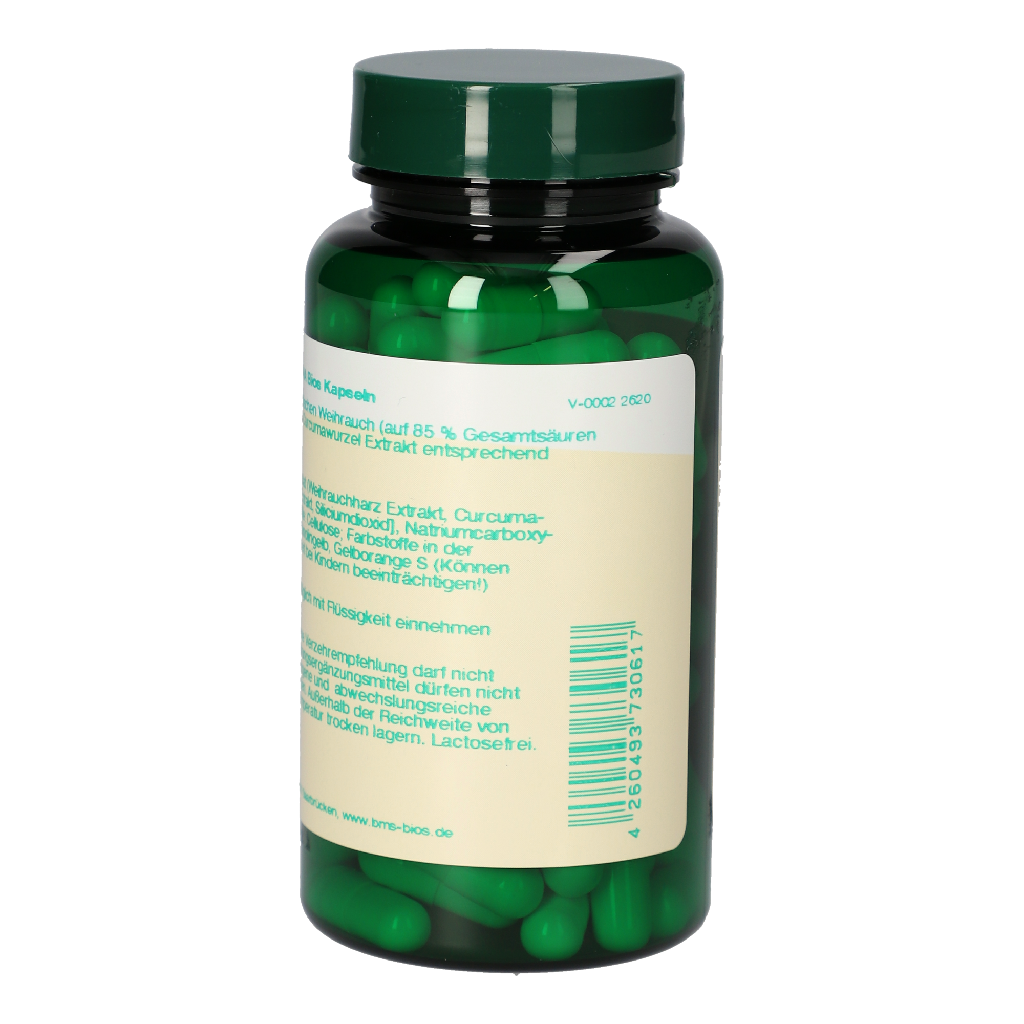1 Kapsel enthält 170 mg indischen Weihrauch (auf 85 % Gesamtsäuren standardisiert) und 170 mg Curcumawurzel Extrakt entsprechend 160 mg Curcuminoiden.