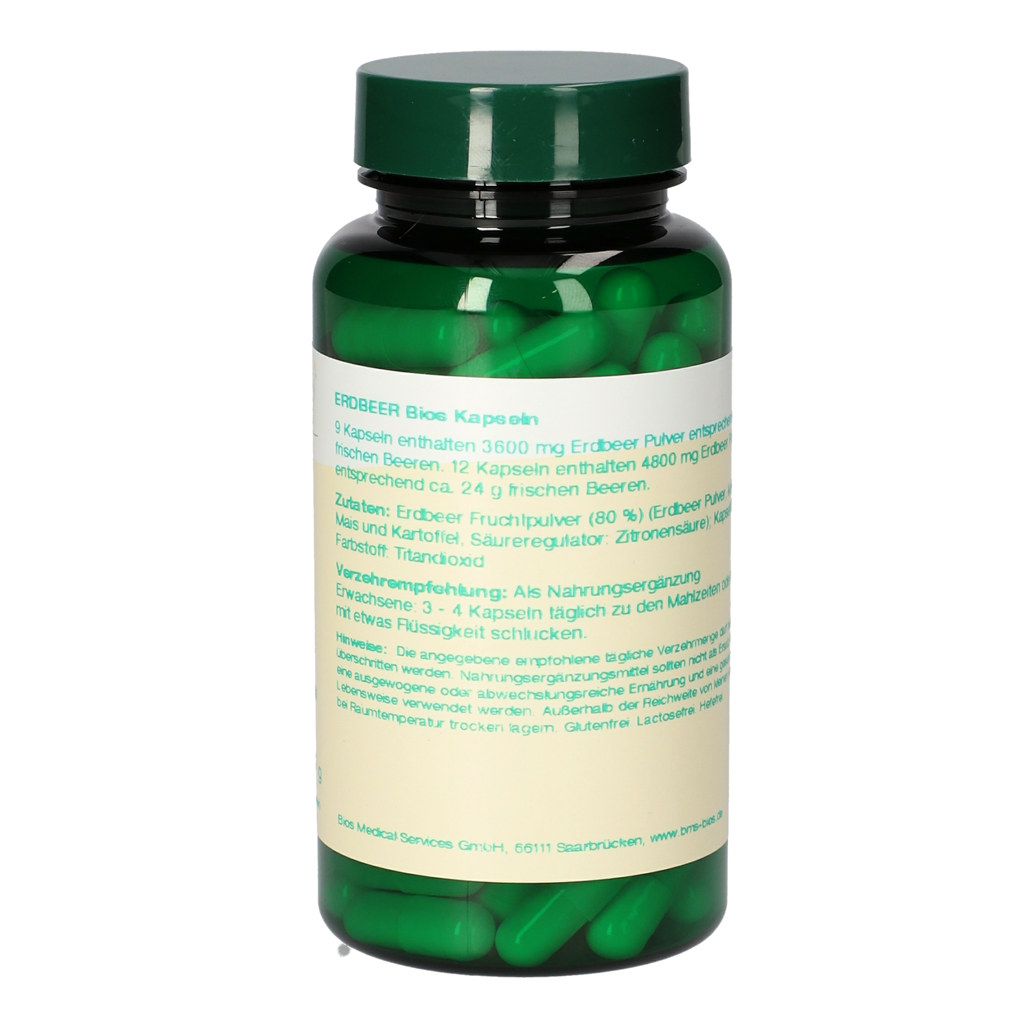 12 Kapseln enthalten 4800 mg Erdbeer Pulver entsprechend ca. 24 g frischen Beeren.
