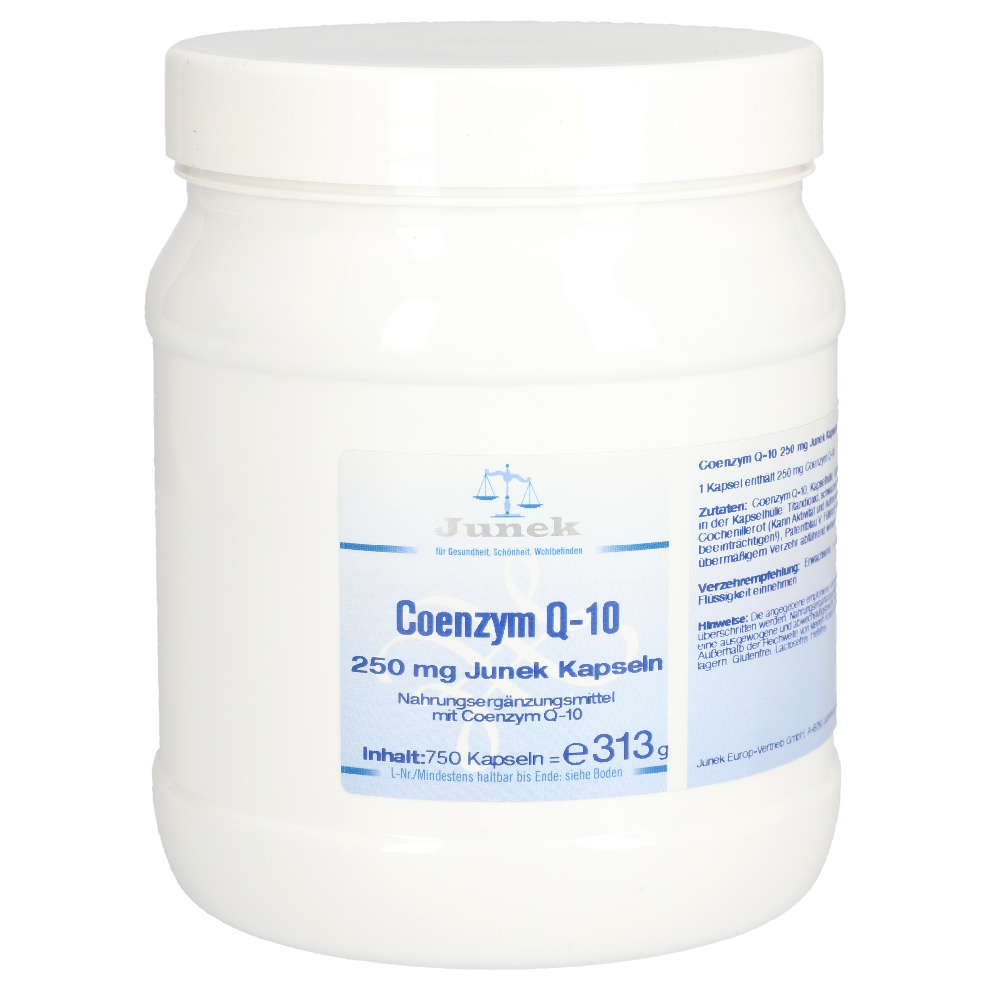 Coenzym Q-10 (= Ubiquinon) ist eine bedeutende Komponente für alle energetischen Prozesse und wird in jeder einzelnen unserer ca. 80 Billionen Zellen im Körper benötigt. In den Mitochondrien, den Kraftwerken unserer Zellen, wird die Energie in Form von ATP produziert. Dies geschieht jedoch nur in adäquater Weise, wenn die Mitochondrien über ausreichende Mengen an Coenzym Q-10 verfügen. Größere Konzentrationen werden vor allem in den Hochleistungsorganen wie Herz, Gehirn, aber auch den Muskeln benötigt, da hier ein gesteigerter Bedarf an stofflicher Energie (ATP) besteht. Interessanterweise ist die Mitochondriendichte der Muskeln bei Sportlern um einiges höher als bei nicht aktiven Personen. Zum Erhalt der Leistungsstärke dieser Muskeln werden daher auch höhere Mengen an Coenzym Q-10 benötigt. Leider nimmt mit zunehmendem Alter die Fähigkeit des Körpers, Coenzym Q-10 zu produzieren, ab. Die Eigenproduktion von Ubiquinon leidet auch bei Dauerstress und bei Personen, die Lipidsenker einnehmen. Die Deckung des Bedarfs über die Nahrungsaufnahme ist zwar möglich, doch leider befinden sich höhere Konzentrationen von Ubiquinon gerade in den Lebensmitteln, die heutzutage nur noch selten konsumiert werden, wie etwa Innereien (Herz, Leber, Niere und Gehirn). Daher hat sich zur Erhaltung der eigenen Energiegewinnungsprozesse eine Nahrungsergänzung mit Coenzym Q-10 bewährt. Coenzym Q-10 250 mg Junek Kapseln enthalten 100 % reines, durch Fermentation hergestelltes Q-10 der Firma Kaneka, welches die weltweit höchste Bioverfügbarkeit aufweist.